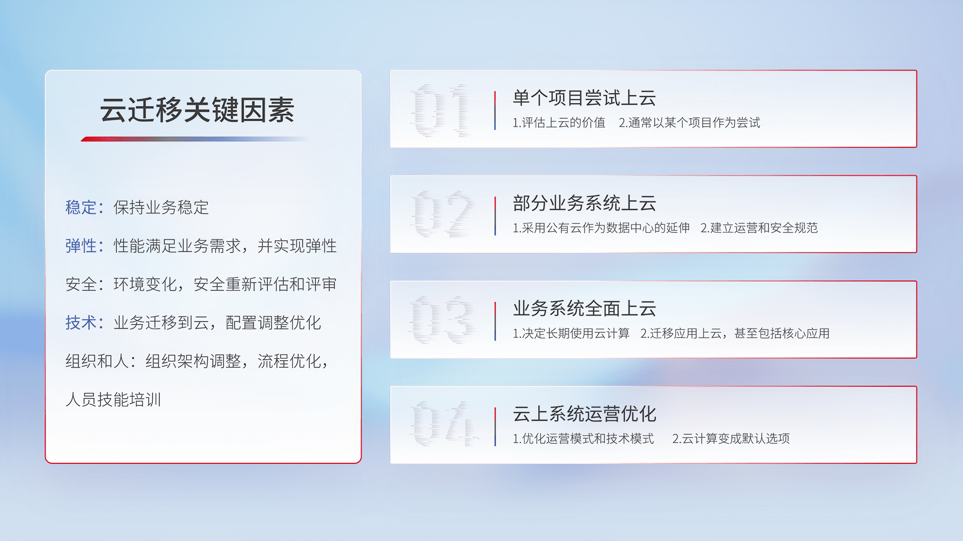 结合实际业务,,,,从规划设计、、、、云平台选型、、、云原生改造、、数据迁移、、集成交付,,迁移全过程为客户识别最佳上云路径,,,做好风险识别管理,,,设计网络架构、、、、身份权限、、、、安全审计合规、、、、操作审计、、日志审计、、、监控告警策略、、多站点容灾设计等,,,,对云上基础设施进行整体规划,,,,提升IT治理水平,,以满足弹性、、、、高可用、、、高性能的需求。。。。